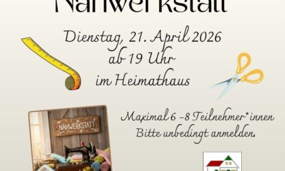Die Nähwerkstatt findet an jedem 3. Dienstag im Monat um 19.00 Uhr in den Räumlichkeiten des Heimatvereins an der Bergstraße 10 statt.