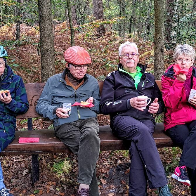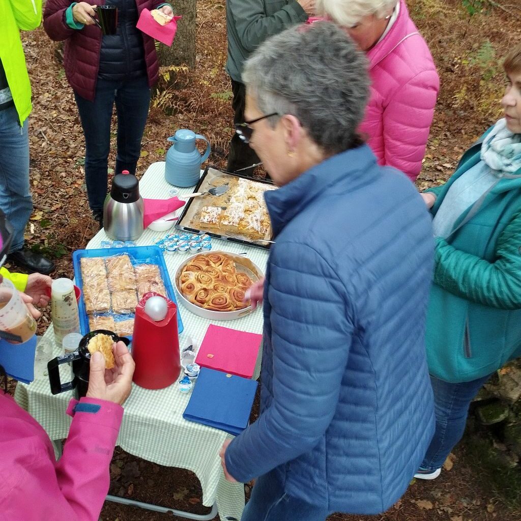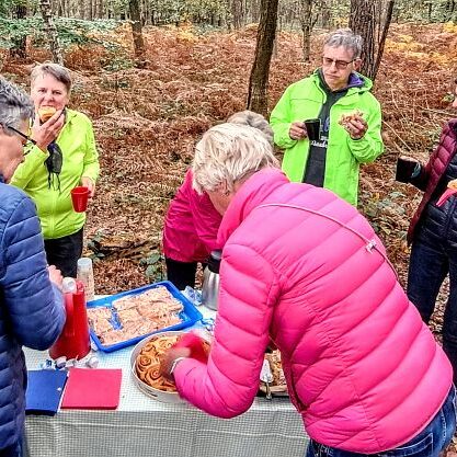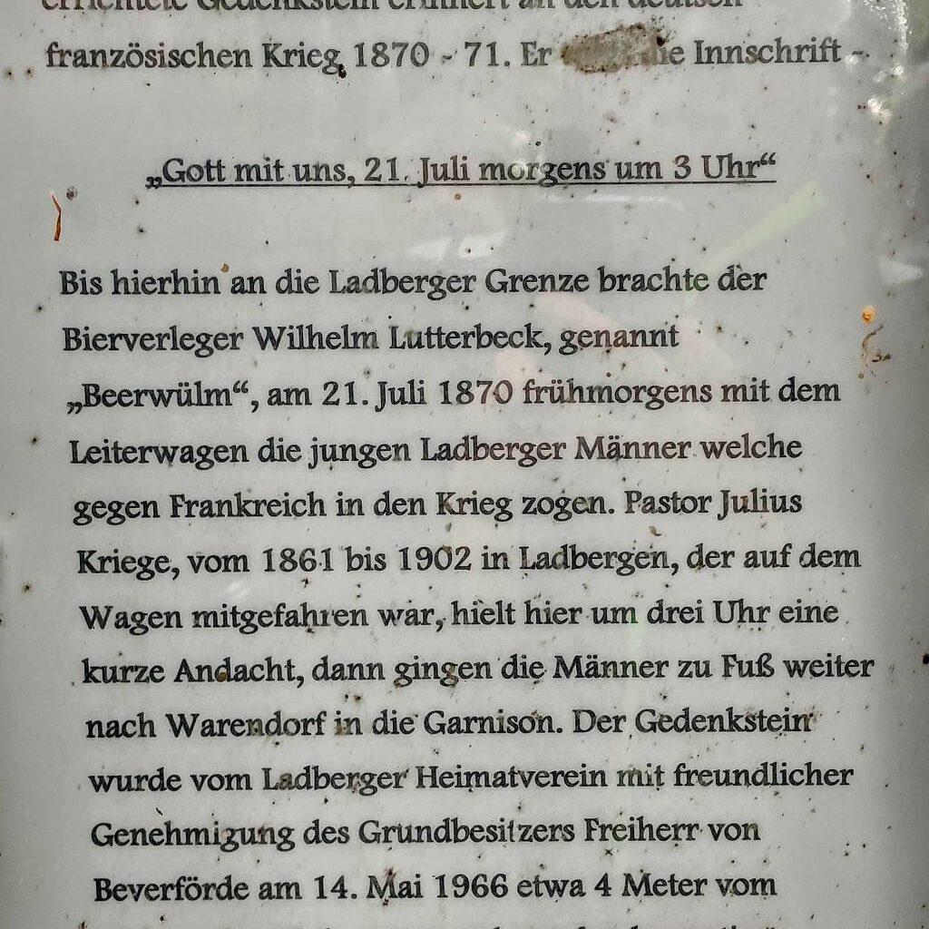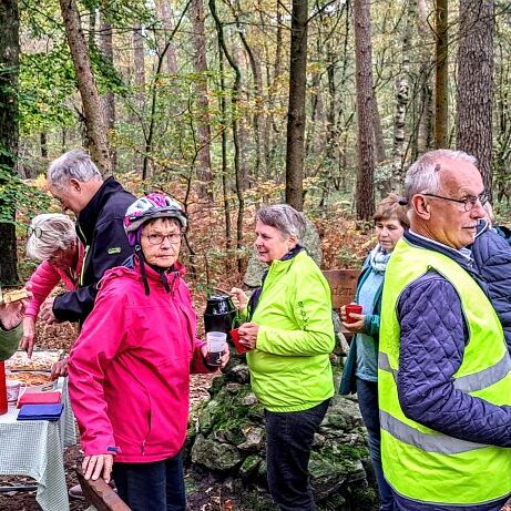 Familie Spuhn (auch Oma und Enkelkinder packten mit an) hatte diesmal eine besondere Überraschung vorbereitet: Am versteckt gelegenen „Sauerkraut-Denkmal“, tief im Wald zwischen Ostbevern-Brock und der Ladberger Moorsiedlung, erwartete die Gruppe köstlich, selbstgebackener Kuchen. Dieser Ort erinnert an Soldaten des Jahres 1870, die von hier aus in den Krieg gegen Frankreich zogen. Später wurden dort Steine errichtet, die an Gewichte auf Sauerkrautgefäße erinnern – daher der ungewöhnliche Name des Denkmals.