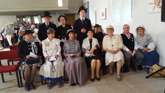 Beim Gemeindefest zum 100jährigen Bestehen der Hohner Kirche nahm die Trachtengruppe des Heimatvereins Lengerich e.V. teil. Mit ihren Kleidungsstücken aus der Zeit von 1900 bis 1930 wie Erntetracht, bäuerliches Nachmittagskleid, Festtagskleidern, gutbürgerliches Nachmittagskleid, Internatsschürze, die Herren mit Gehrock, schwarzer Hose und Zylinder, boten sie ein buntes Bild und bereicherten die Veranstaltung. Schon im Gottesdienst wurde die Trachtengruppe begrüßt. Zum Erinnerungsfoto…