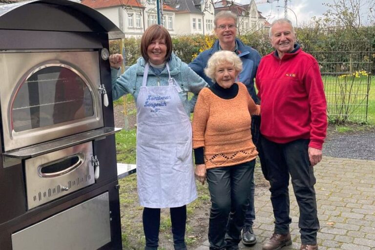 Gebacken wird in der Zeit von 11 Uhr bis 15 Uhr. Der Ofen wird bereits ab 9:30 Uhr vorgeheizt. Das Team sind Gundula, Stefan, Hannelore und Rolf.