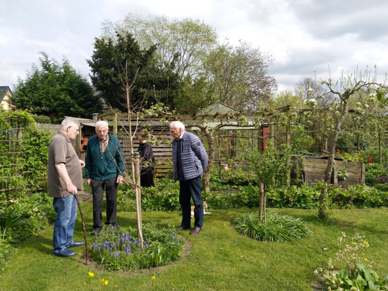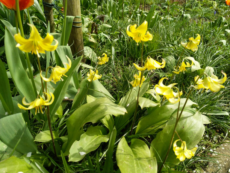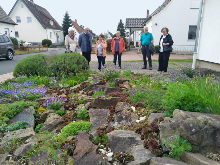 Hinter dem Haus betreiben Egon und Irmgard einen Zier- und Nutzgarten. Beeindruckend ist die bunten Vielfalt des seit Jahren mit viel Liebe gepflegten Gartens. Ein Feuchtbiotop wird von üppig blühende Tulpen, Hundszahnlilien, Elfenblumen und andere Kostbarkeiten umrandet. Gemüse für den Hausgebrauch wird in selbst gebauten Hochbeeten gezogen und Gewächshaus wuchern bereits die jungen Tomatenpflanzen. Auch säulenförmige Obstbäume und ein paar idyllische Sitzecken haben im Garten der Dickaus noch Platz.