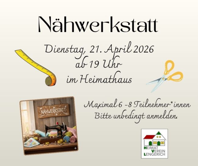Kurzfristig noch Plätze frei geworden. Das Angebot richtet sich gleichermaßen an Anfängerinnen und Anfänger, die erste Erfahrungen an der Nähmaschine sammeln möchten, sowie an Fortgeschrittene, die in geselliger Atmosphäre an eigenen Projekten arbeiten wollen. Unter fachkundiger Anleitung lernen die Teilnehmenden nicht nur den sicheren Umgang mit der Nähmaschine, sondern auch alle wichtigen Schritte zur Anfertigung…