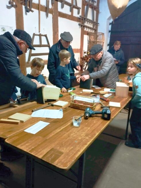 Viel Spaß für Jung und Alt brachte das erste Treffen junger Baumeister mit den erfahrenen Handwerkern des Heimatvereins Lengerich/Westfalen (HVL). Ausgerüstet mit Bauplänen und Hämmern ging es um 10:00 Uhr ans Werk, Nistkästen zu bauen. Die Begeisterung auf beiden Seiten war offensichtlich. Während auf der Tenne gezimmert und gehämmert wurde, freuten sich die Mütter über eine kundige Führung rund ums Heimathaus.