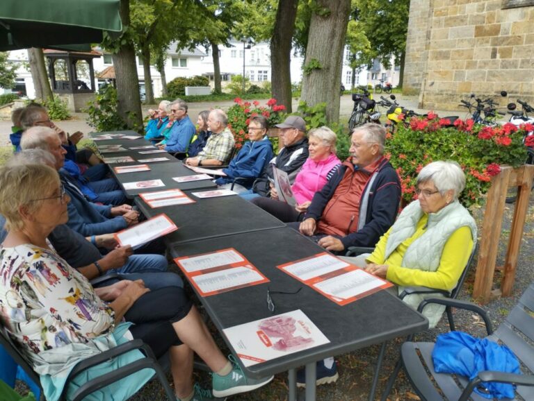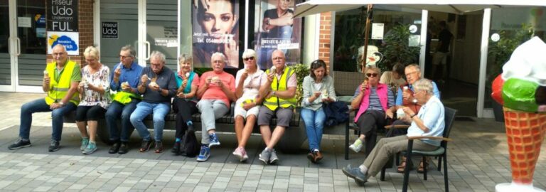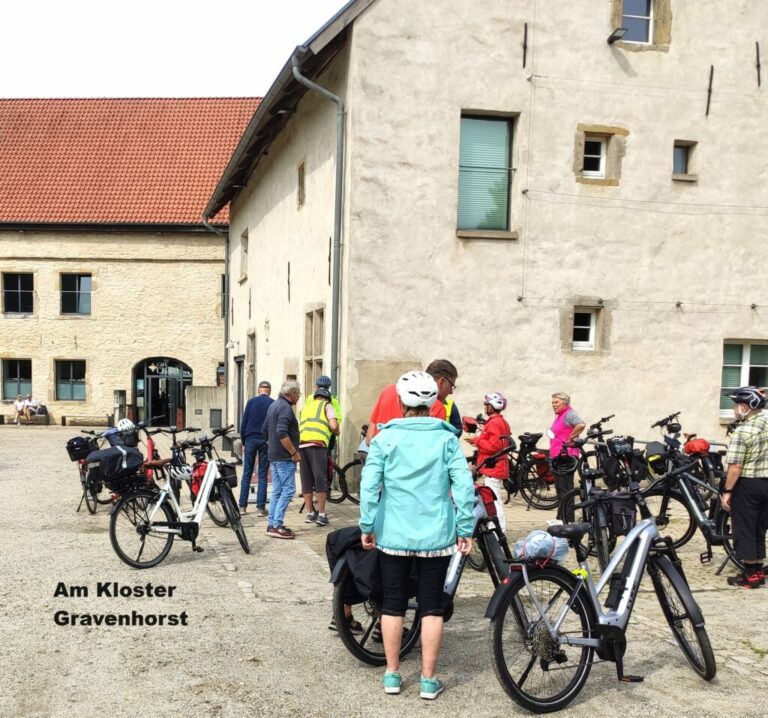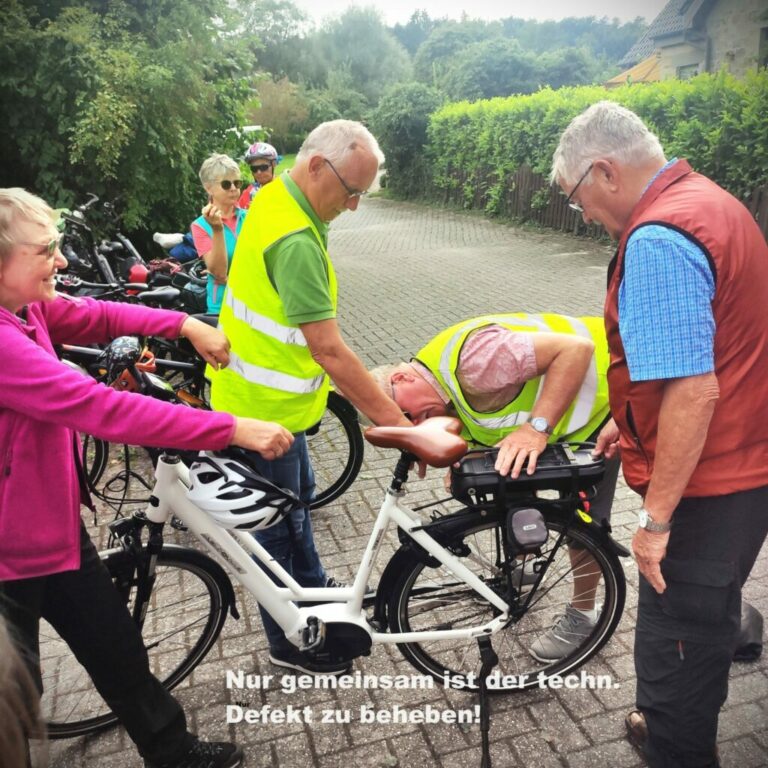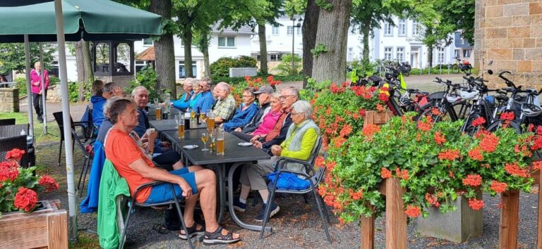 Unter dem Kirchturm von Riesenbeck stärkten sich die Radler, bei dezent läutenden Glocken. Der Rückweg führte am Kloster Gravenhorst vorbei, Ibbenbüren, Brochterbeck zur Eisdiele nach Lengerich. Leider hatten wir bei dieser Tour einen technischen Ausfall und engagierte Techniker aus der Gruppe verhinderten im Team einen weiteren, dank gemeinsamer Reparatur.