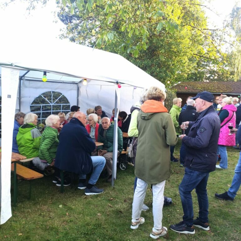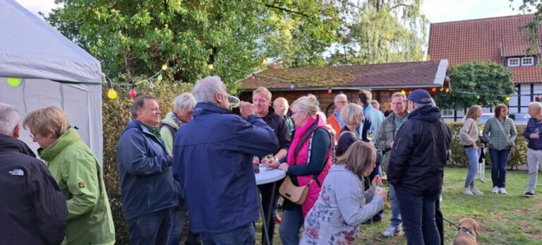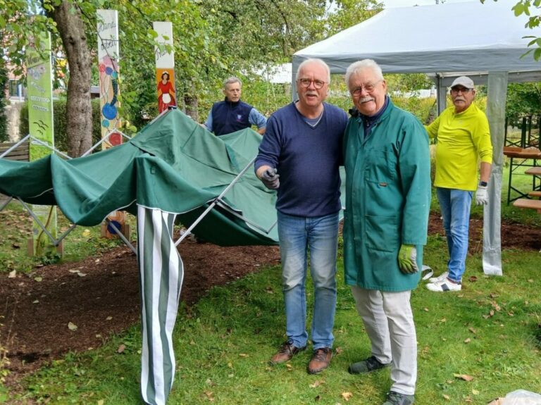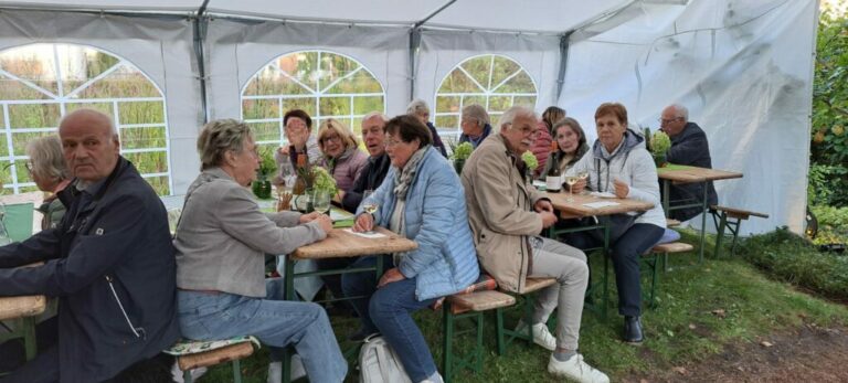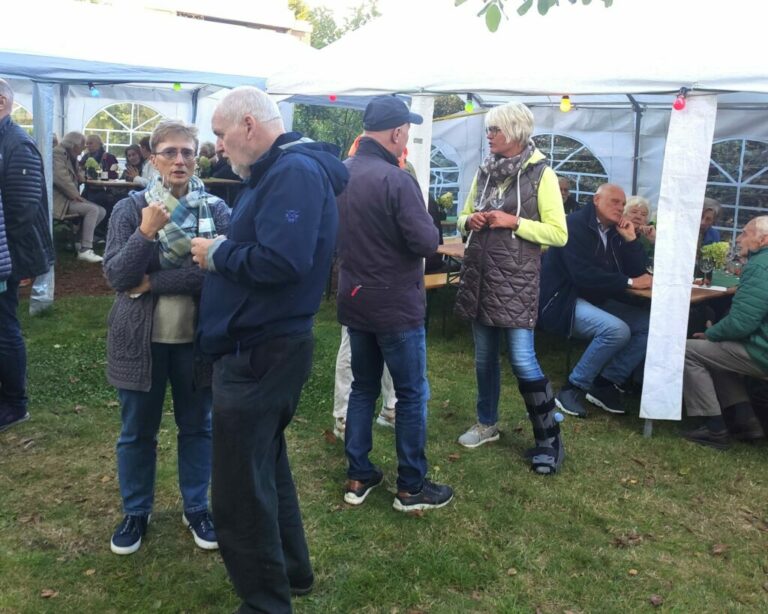 Den ganzen Freitagmorgen werkelten emsige Hände am Aufbau des Zeltdorfes. Und dann: Nur „die Harten“ kommen bei erfrischenden Temperaturen in den Heimathausgarten? Weit gefehlt. Volle Hütte meldet abends der Heimatverein bei seinem diesjährigen Weinfest!